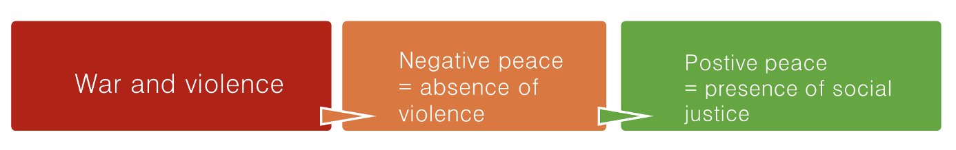 Peace in politics is both the absence of violence and war, and the presence of social justice. The absence of violence is understood as negative peace, while positive peace is achieved when there is equality and social justice for all members of society.[1] Other characteristics that are associated with positive peace are harmony, equilibrium, and tranquillity. Ultimately, the highest goal is to achieve a peace that is sustainable and will last long-term. After negative peace, achieving positive peace is the next step on the path to sustainable peace.