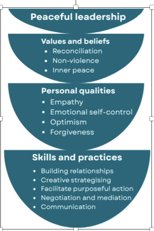 In addition to the peaceful leaders' personality traits and strong morals, they are adept at a set of skills and practices that will help them achieve their goals. These include: ’Building relationships, crafting a public narrative that facilitates purposeful action, engaging in creative strategising to challenge those with power, and catalysing action.’[4] Additionally, they have excellent communication, negotiation, and mediation skills.