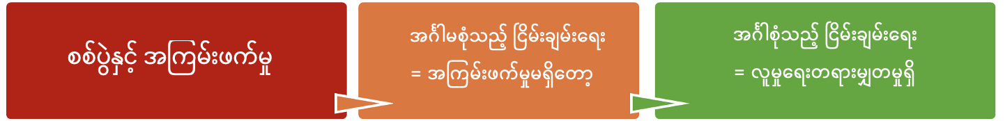 သမားရိုးကျ အစိုးရပြင်ပ လူမှုဘဝ ပြန်လည်ပေါင်းစည်းရေး - လွှတ်တော်ထဲက ရွာသူကြီးများ၊ ရိုးရာခေါင်းဆောင်များ - အများတရားဝင်လက်ခံအသိအ မှတ်ပြုမှုနှင့် ယုံကြည်စိတ်ချရမှု မြင့် မားတိုးတက်လာစေခြင်း - အရဲစွန့်ရမှုအန္တရာယ်နည်းပါး |