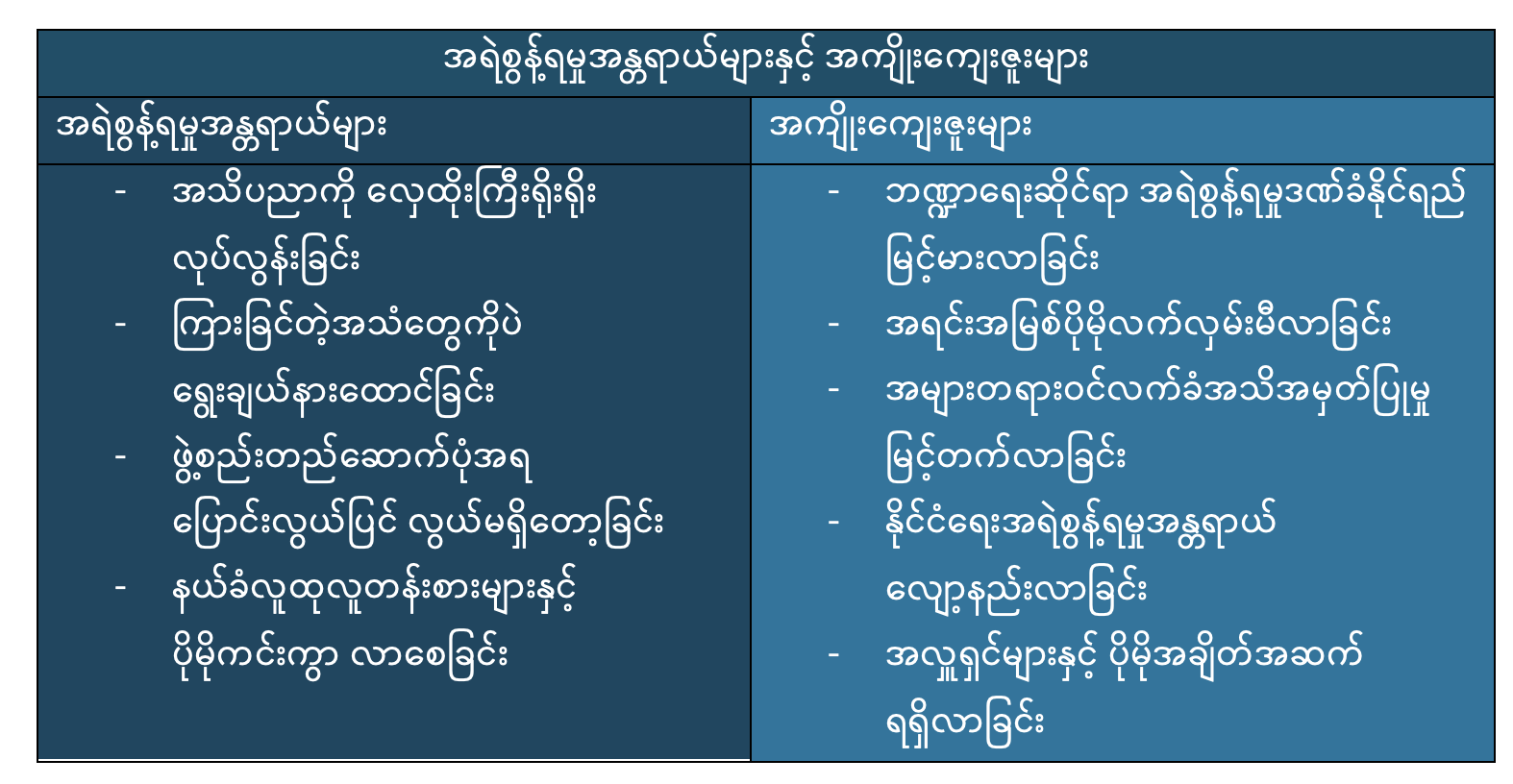 ဆက်လက် မြင့်တက်လာနေတဲ့ လူ့အခွင့်အရေး ချိုးဖောက်မှုတွေနဲ့ စစ်အာဏာရှင်ရဲ့ စေ့စပ် ညှိနှိုင်းလိုတဲ့ စိတ်ဆန္ဒကင်းမဲ့နေမှုက အခြေခံမူတွေကနေ ဖယ်ခွာပြီး ပိုပြီးအားကောင်းတဲ့ အရေးယူ ဆောင်ရွက်မှုတွေလုပ်ဖို့ အာဆီယံအတွက် လုံလောက်တဲ့ အကြောင်းပြချက်တွေ ဖြစ်ပါတယ်။ နိုင်ငံရေးခေါင်းဆောင်တွေအနေနဲ့ စစ်အာဏာရှင်ရဲ့ လူ့အခွင့်အရေး ချိုးဖောက်မှုတွေနဲ့ ပြန်လည် သင့်မြတ်လိုတဲ့ စိတ်ဆန္ဒကင်းမဲ့မှုကို အကြောင်းပြုပြီး ပိုမိုပြင်းထန်တဲ့ အရေးယူမှုတွေ လုပ် ဆောင်ပေးဖို့ အာဆီယံကို စည်းရုံး အရေးဆို နိုင်ပါတယ်။ ဒါ့အပြင် အာဆီယံရဲ့ ပိုမိုသင့်တော်တဲ့ အရေးယူ ဆောင်ရွက်ချက်တွေက နိုင်ငံတကာ အသိုက်အဝန်းဆီကို မိမိတို့အနေနဲ့ စစ်အာဏာရှင် ကျူးလွန်နေတဲ့ ပြစ်မှုတွေကို လက်သင့်မခံပါဘူးဆိုတဲ့ သတင်းစကားပါးရာ ရောက်ကြောင်းကိုလည်း မီးမောင်းထိုး ပြောဆိုနိုင်ပါတယ်။ မစွက်ဖက်ရေးဆိုတဲ့ အခြေ ခံ အုတ်မြစ်ပေါ် မှီခိုအားထားနေတာထက် အနှစ်သာရပြည့်စုံတဲ့ အင်္ဂါစုံ ငြိမ်းချမ်းရေးအယူအဆနဲ့ လူ့အခွင့်အရေး ကာကွယ်စောင့်ရှောက်ရေး အခြေခံမူတွေပေါ် သန္ဓေတည်မယ့် အခြေခံအုတ်မြစ် တစ်ခုကို ပြန်ပြီးညှိနှိုင်း သဘောတူညီမှုရယူမယ့် အာဆီယံလမ်းကြောင်းသစ်ကို ပျိုးထောင် ယူနိုင်ပါတယ်။